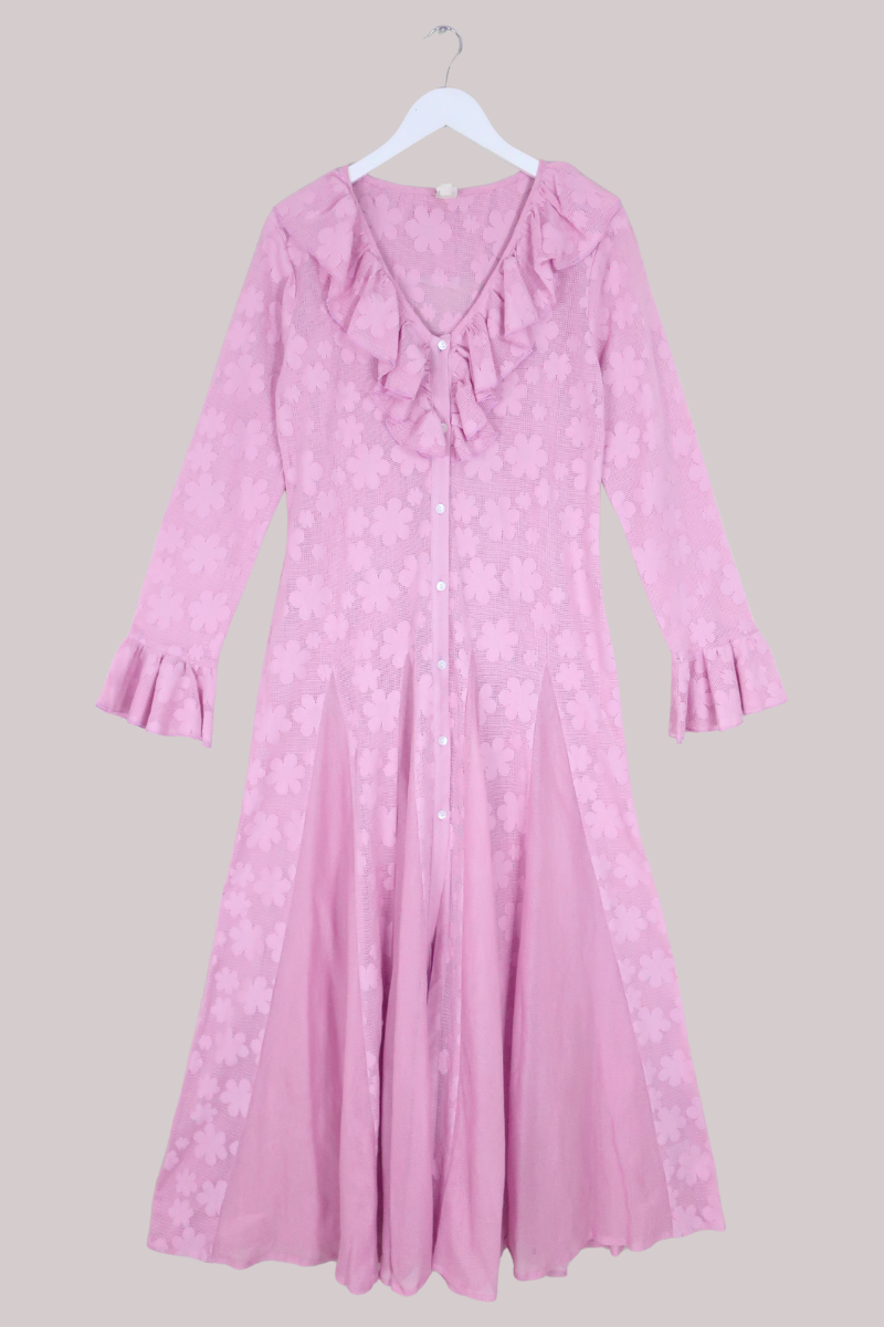 Command the stage in our Harriet maxi length button-up lace robe in a soft shade of Fantasy Pink.