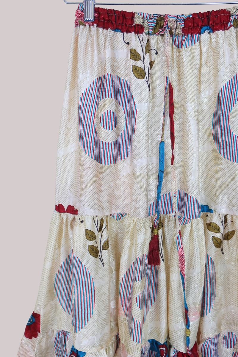 An absolutely beautiful midi length tiered broomstick style skirt with an adjustable drawstring waist. Handmade in floaty vintage Indian sari material - each one is completely unique!