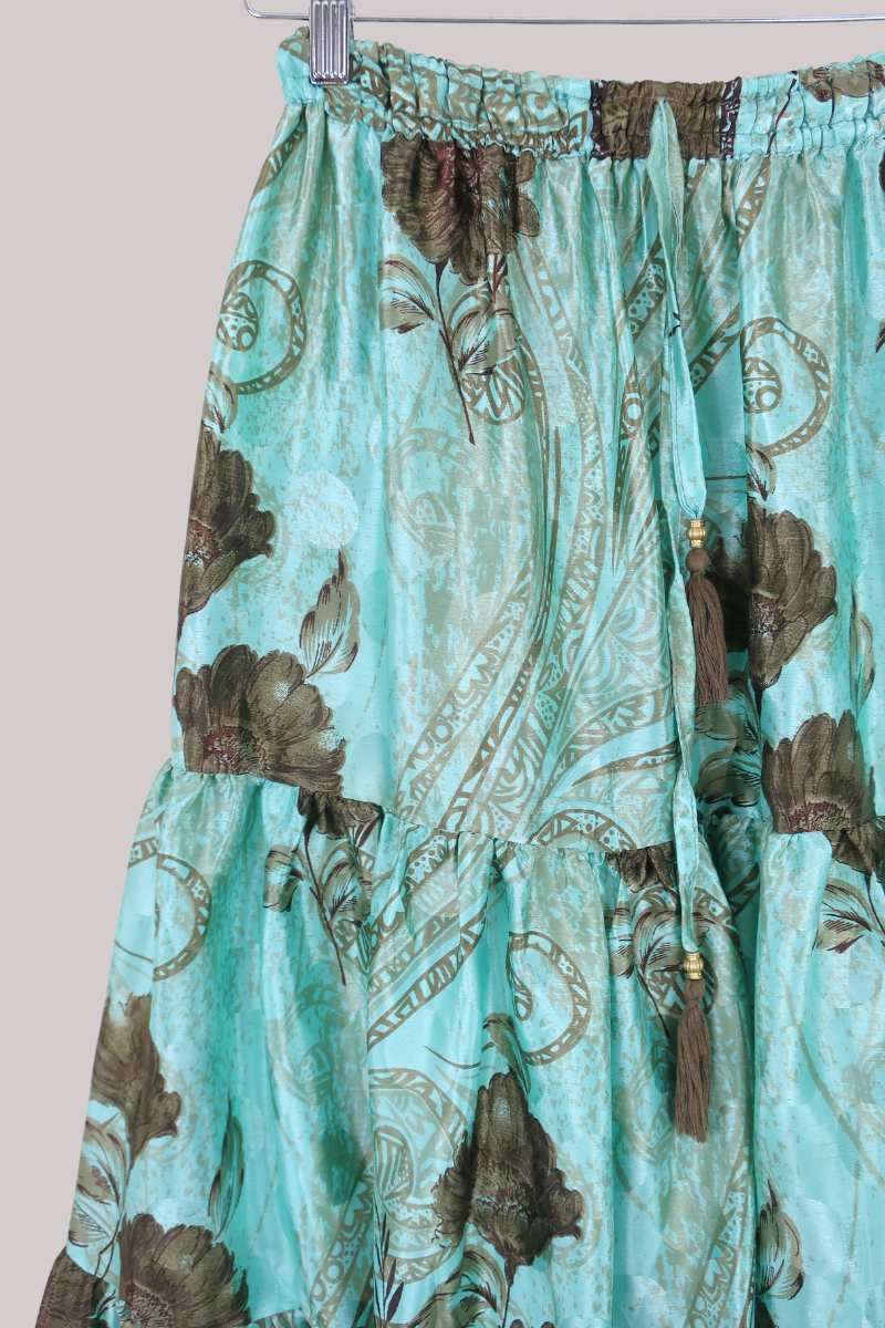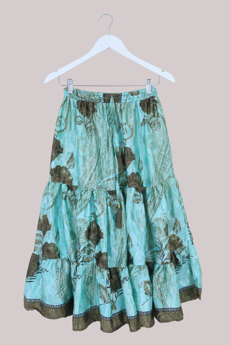 An absolutely beautiful midi length tiered broomstick style skirt with an adjustable drawstring waist. Handmade in floaty vintage Indian sari material - each one is completely unique!