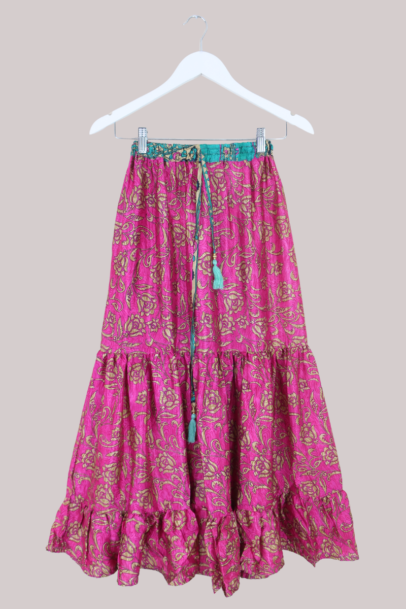 An absolutely beautiful midi length tiered broomstick style skirt with an adjustable drawstring waist. Handmade in floaty vintage Indian sari material - each one is completely unique!