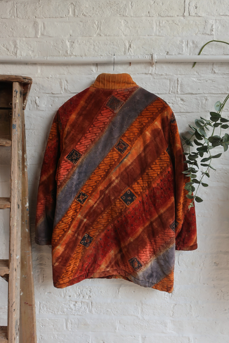 A retro, cosy vintage velvet jacket in warm shades of brown and orange - perfect to bundle up in in the chillier months.