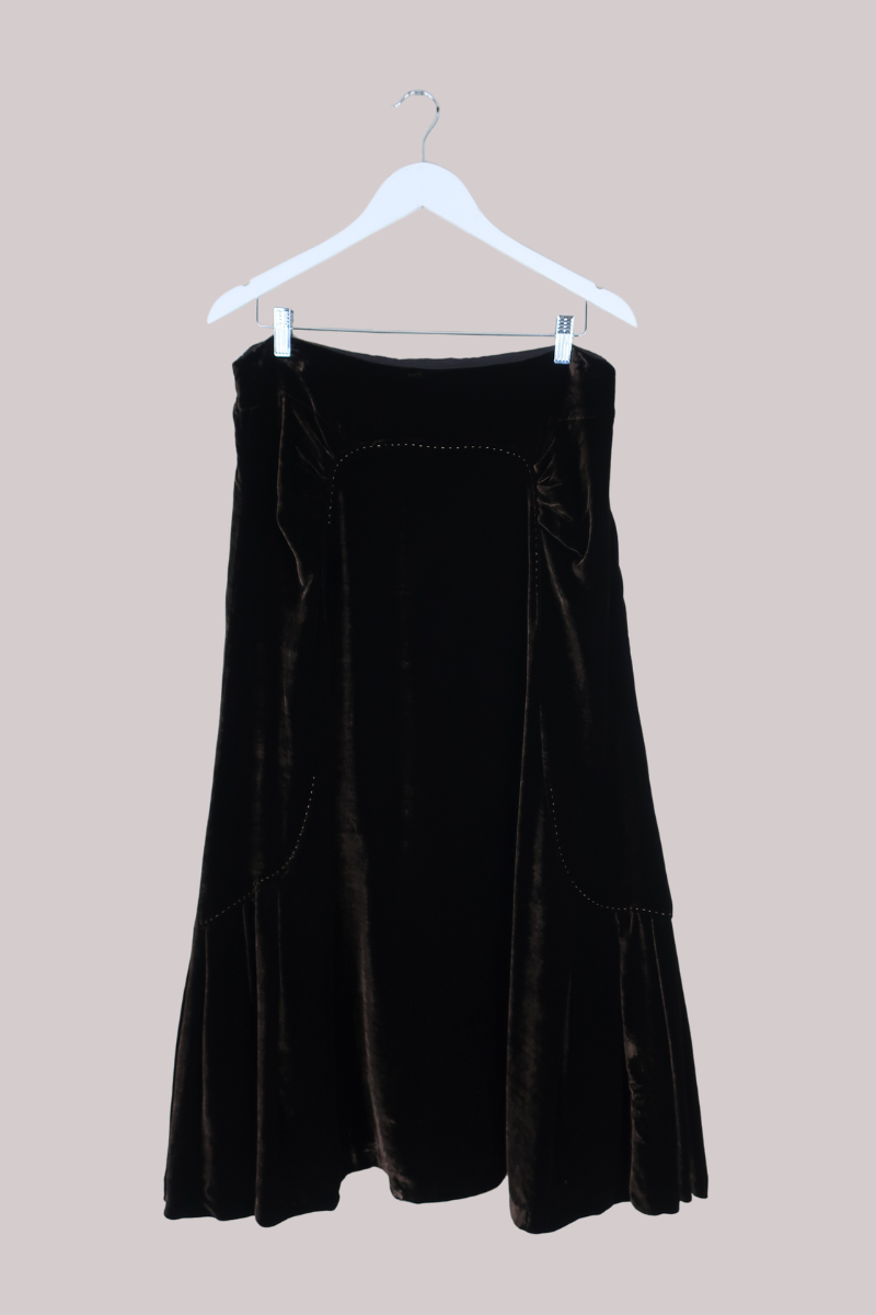 A gorgeous vintage maxi skirt in deep cedar brown velvet, with embroidered detailing on the front, and a zip down the back to secure.