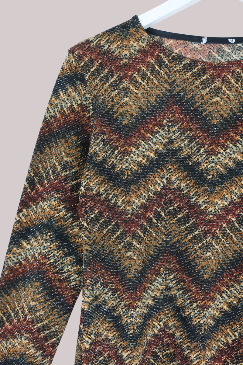 A vintage long sleeve top in earthy shades of warm brown and red, in an abstract zigzag print, with glitter laced throughout.