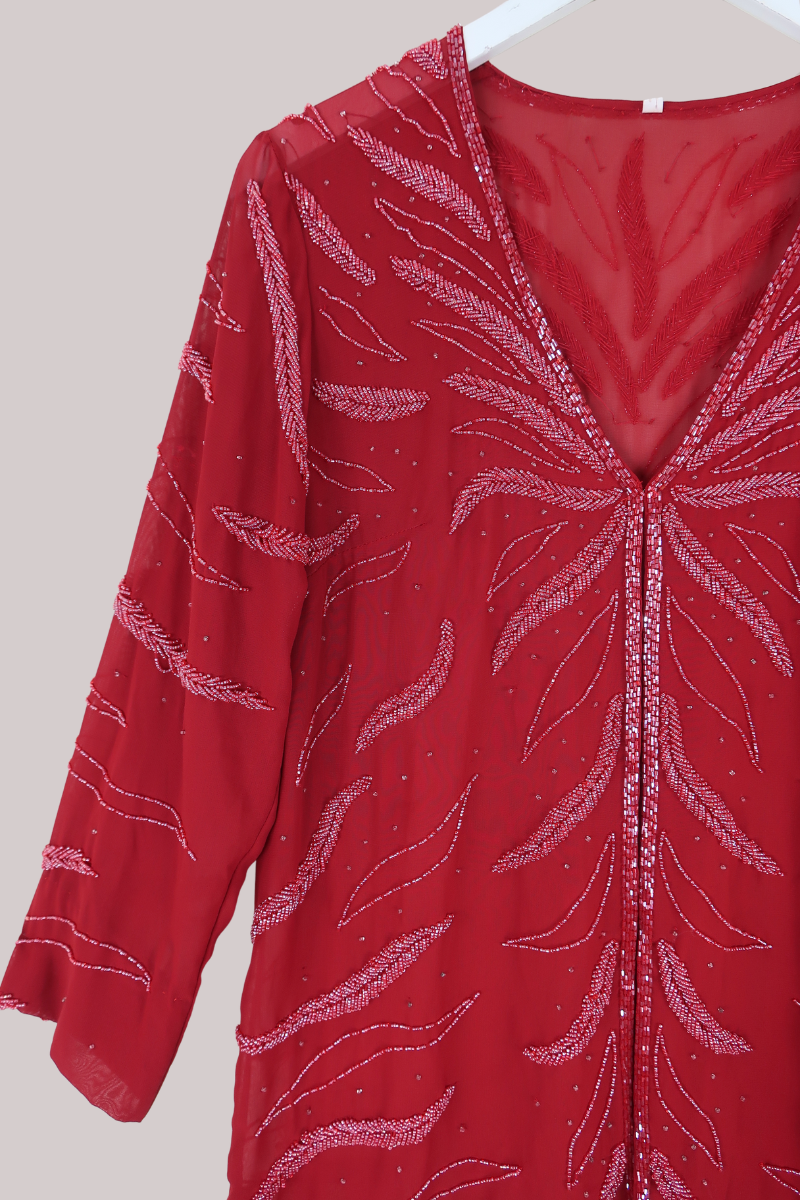 A scarlet vintage blouse/cardigan, with stunning red beadwork and one clasp at the front to secure.