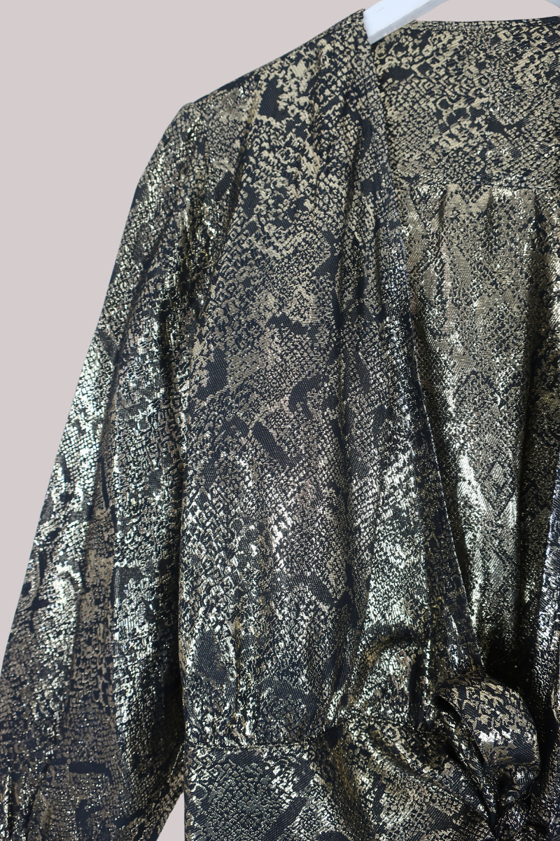 A glamorous, slinky vintage wrap top in opulent shades of gold and a stunning snake print design. Slightly sheer.