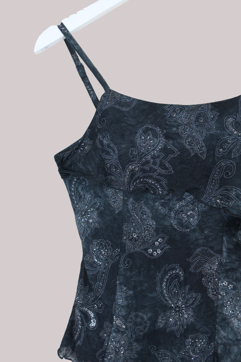 A y2k style black floaty cami top in black with a hazy paisley design, and asymmetrical hem. The bust is lined, while the rest is sheer.