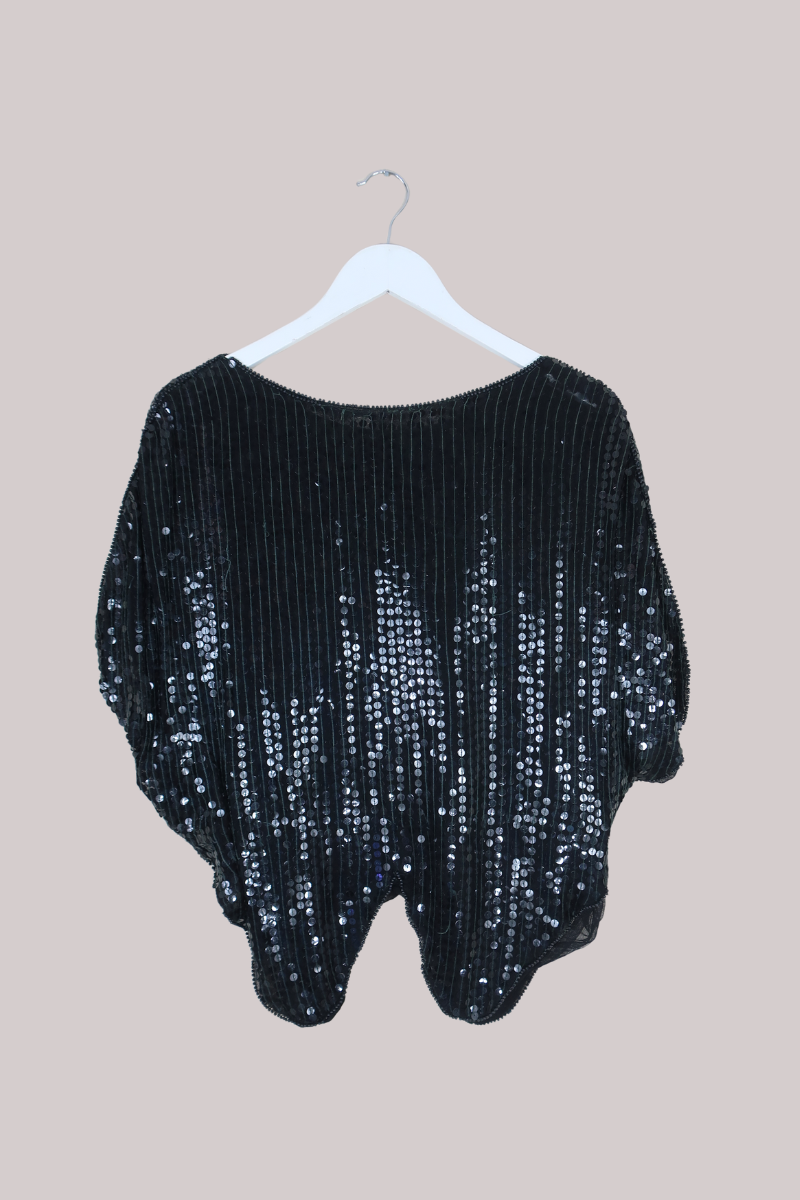 A black vintage cape/top, covered in sequins with an icy teal floral design on the front.