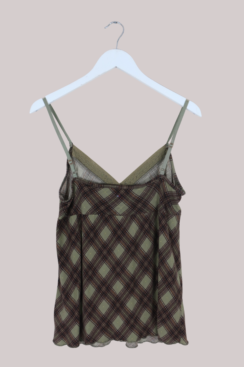 An adorable vintage staple for your wardrobe, in a beautiful shade of olive green, featuring a classic plaid design with little sequins.