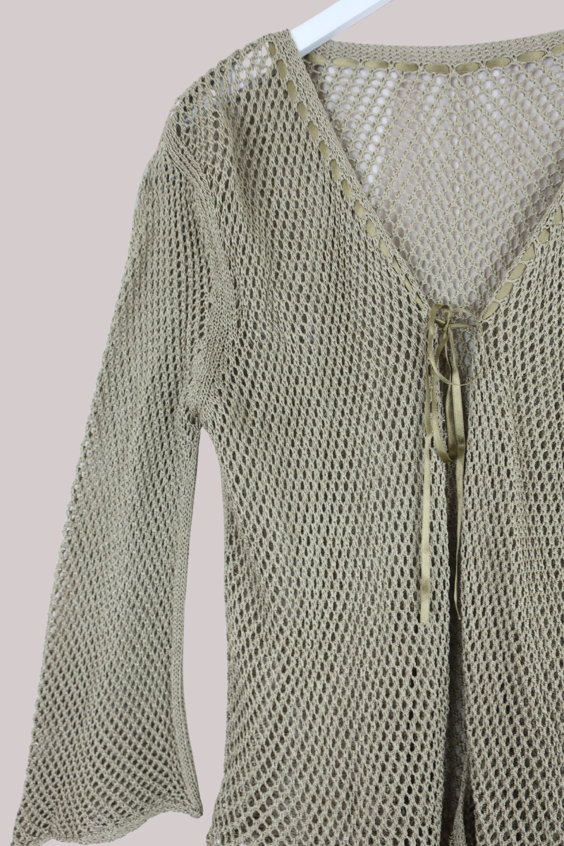A vintage sheer crochet sage green cardigan/blouse, with full length bell sleeves and one tie at the front to secure.