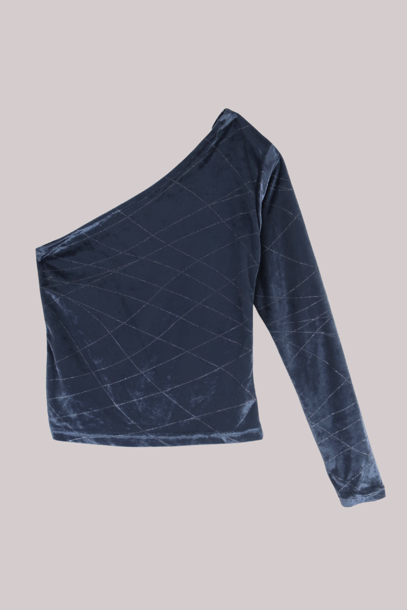 A one-shouldered slate grey vintage top, made from velvet and with silver embroidery for a touch of shimmer.